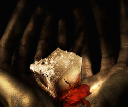 Ici, deux mains soutiennent ce qui semble être un joyau, un lingot, d'un métal précieux. Cependant, on remarque